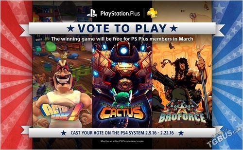 索尼刚公布了3月份美服的“PS Plus Vote to Play”活动将在2月9号展开,持续时间是16年2月9号到16年2月22日。这次的三个候选游戏分别是《武装兄弟连(Broforce)》、《卡图斯:进击的机器人( Assault Android Cactus)》、《动作影星亨克( Action Henk)》。